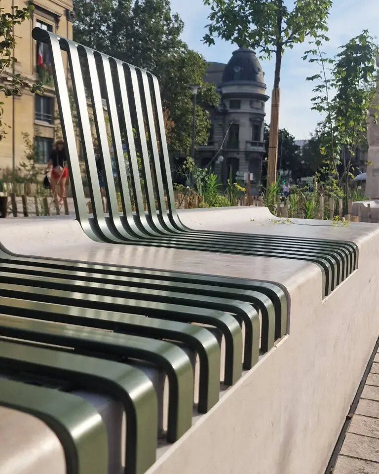 La transformation de la place s’appuie sur une matérialité à la fois robuste et attentive aux ressources existantes. Le projet valorise le réemploi des matériaux présents sur site : pavés anciens, bordures en granit, revêtements réutilisés ou recyclés pour composer de nouvelles surfaces. Cette approche limite l’extraction de matières neuves tout en donnant une identité forte aux sols. Entre minéral et végétal, la palette se veut sobre, durable et capable de dialoguer avec l’architecture existante. Les matériaux ne sont plus seulement techniques : ils participent pleinement à l’ambiance et à la qualité sensible du lieu.